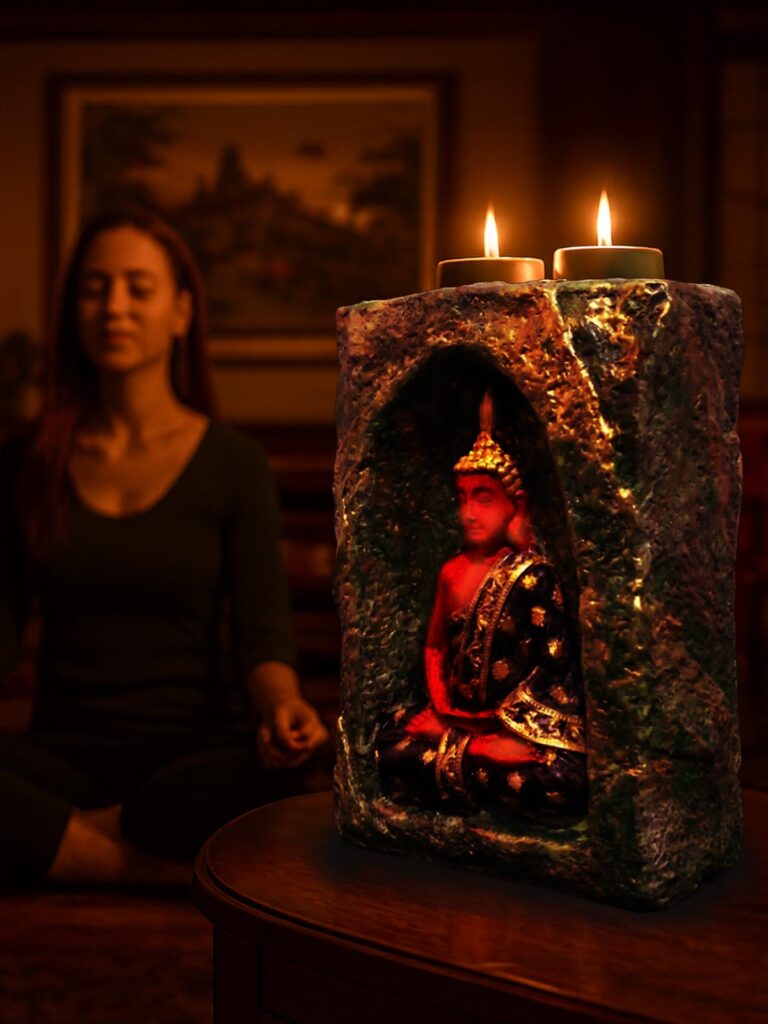 Kahverengi Mağara İçinde Altın-Siyah Buda Taş Tozu Mumluk