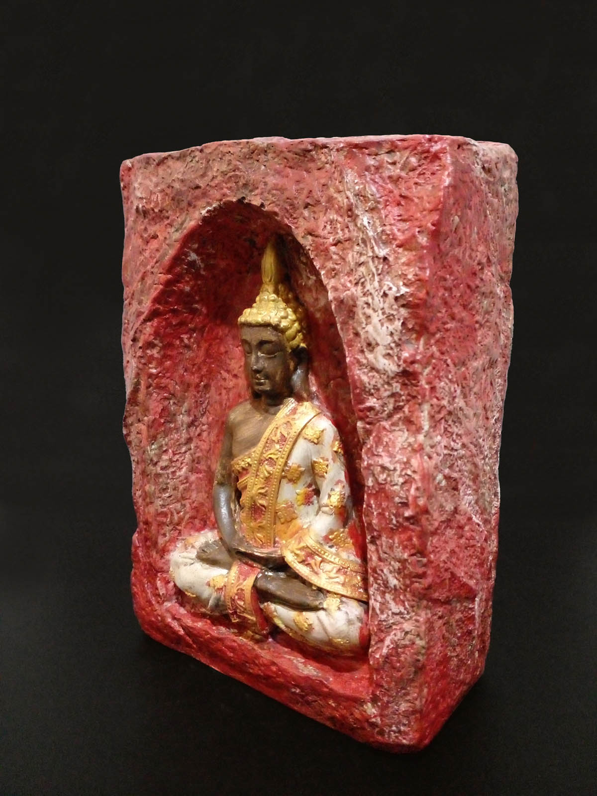 Bu mağara içinde meditasyon yapan Buda temalı tealight mumluk (orta boy), dekoratif bir obje olmanın ötesinde, yaşam alanınıza huzur ve dinginlik taşıyan özel bir parçadır. Taş tozundan dökülmüş ve ustalıkla elde boyanmış olan bu figürde, mağara tamamen kırmızı, kahverengi ve beyaz renklerle boyanmış olup, Buda ise kahverengi rengi ve beyaz elbisesi ile ortada meditasyon yapmaktadır. Üzerine uygulanan mat vernik, boyanın uzun süre korunmasını ve dayanıklılığı artırır.