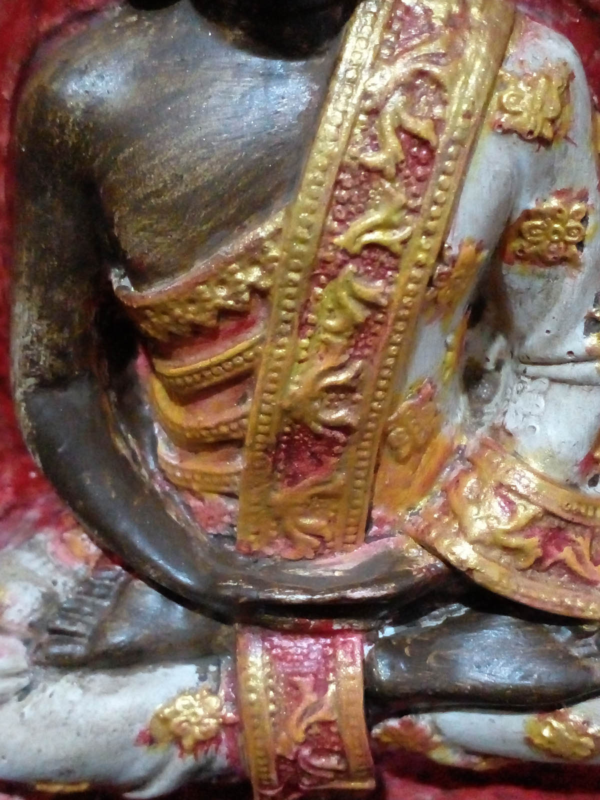 Detaylar: Buda kahverengi renkli. Elbise beyaz renkli. Elbise işlemeleri altın ve kırmızı renkli. Saçlar altın renkli. Mağara kırmızı, kahverengi ve beyaz renkli.