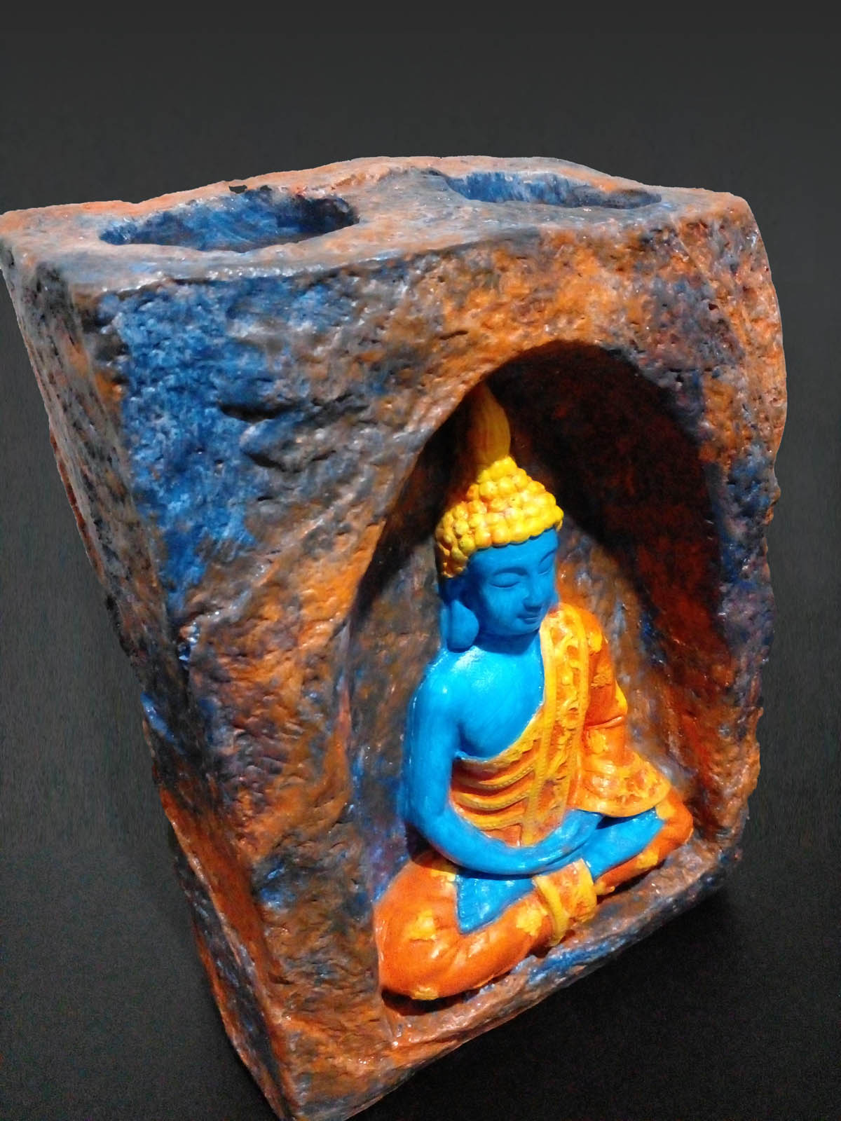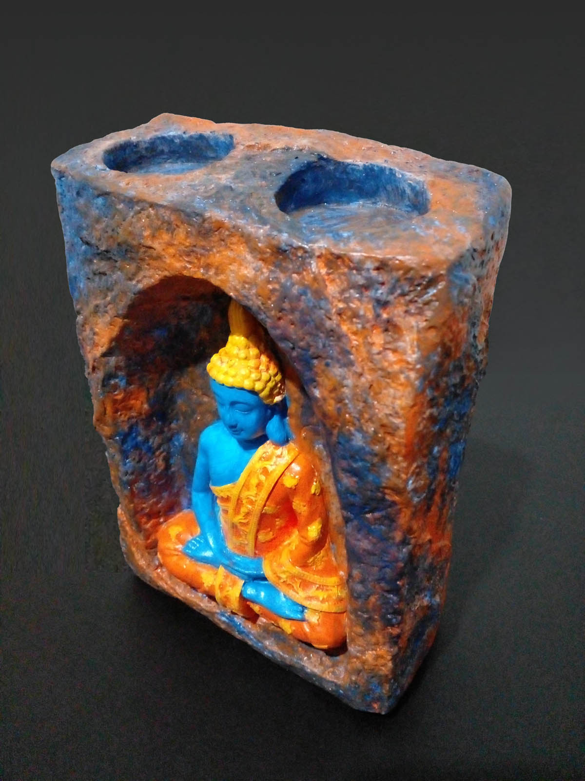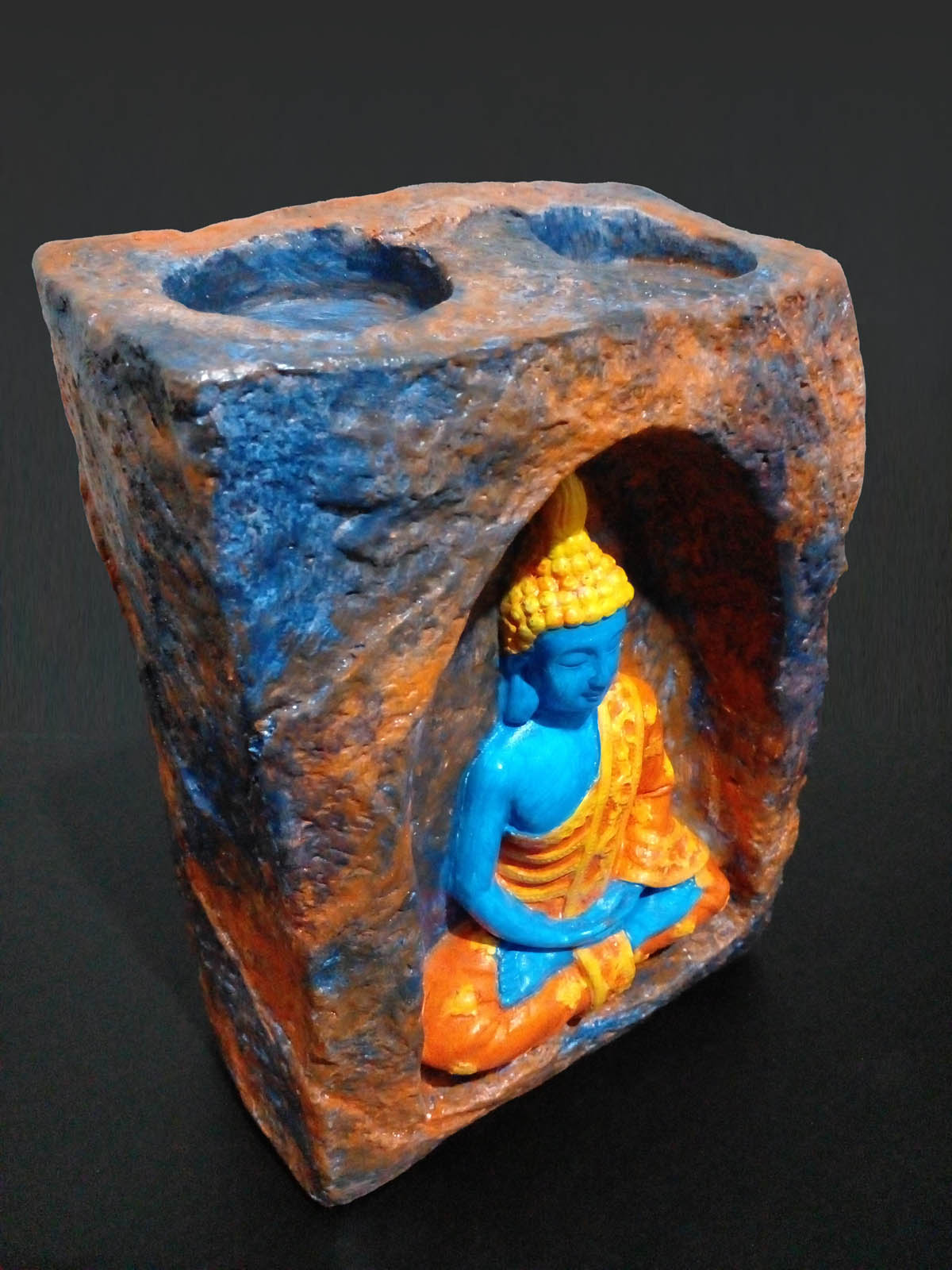 Bu mağara içinde meditasyon yapan Buda taş tozu mumluk (orta boy), dekoratif bir obje olmanın ötesinde, yaşam alanınıza huzur ve dinginlik taşıyan özel bir parçadır. Taş tozundan dökülmüş ve ustalıkla elde boyanmış olan bu figürde, mağara tamamen kahverengi, turuncu ve mavi renklerle boyanmış olup, Buda ise mavi rengi ve sarı işlemeli turuncu elbisesi ile ortada meditasyon yapmaktadır. Üzerine uygulanan mat vernik, boyanın uzun süre korunmasını ve dayanıklılığı artırır.