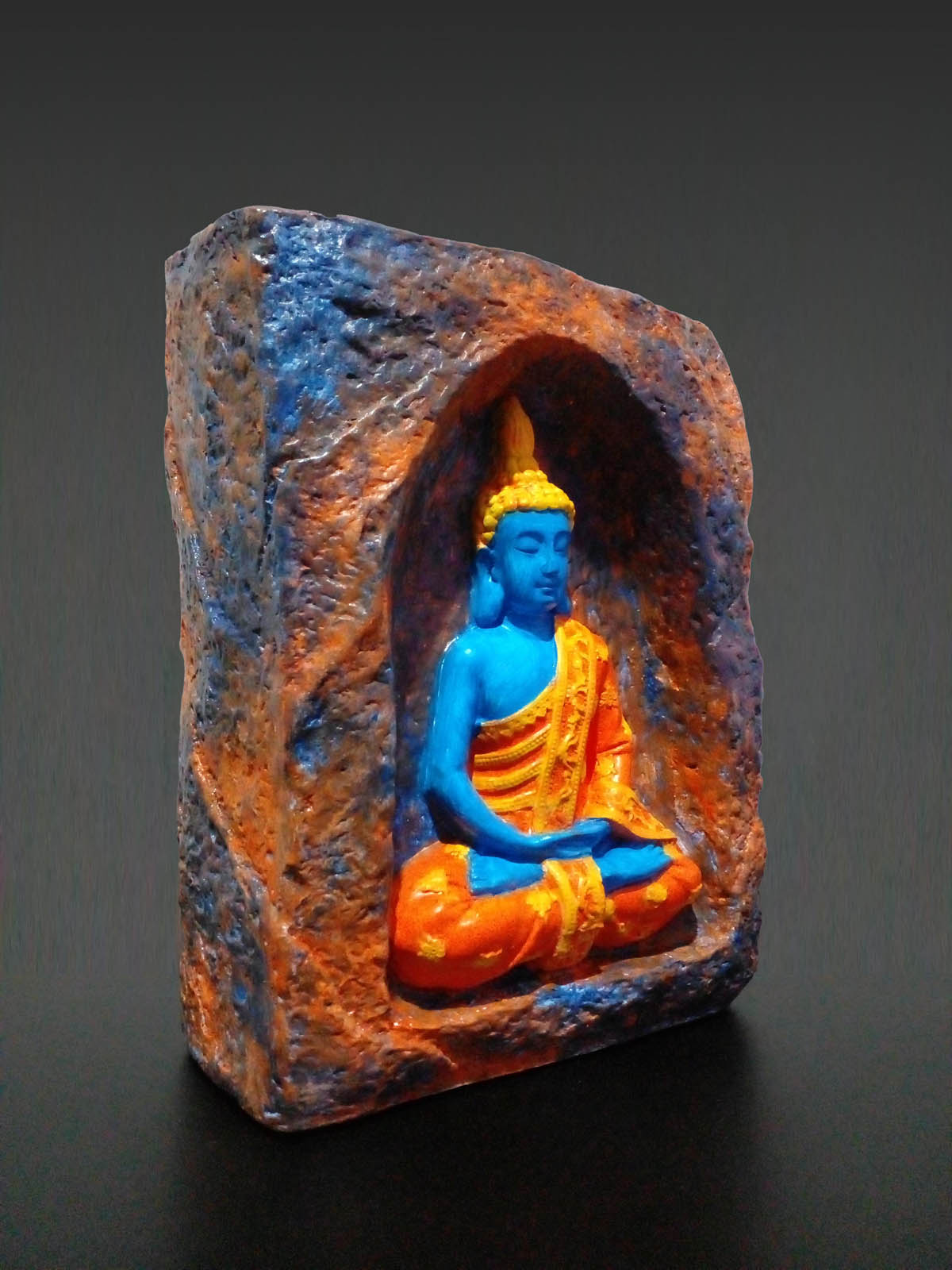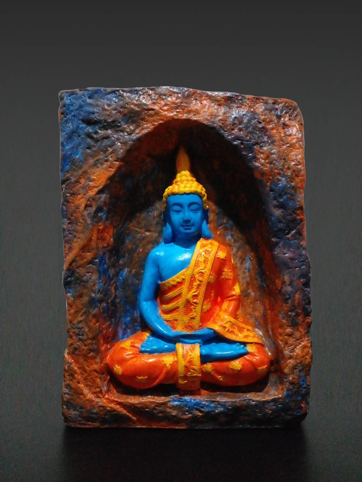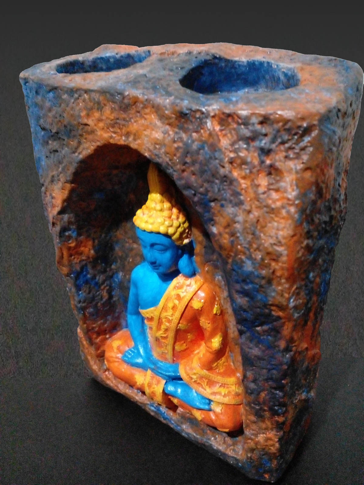 Bu mağara içinde meditasyon yapan Buda taş tozu mumluk (orta boy), dekoratif bir obje olmanın ötesinde, yaşam alanınıza huzur ve dinginlik taşıyan özel bir parçadır. Taş tozundan dökülmüş ve ustalıkla elde boyanmış olan bu figürde, mağara tamamen kahverengi, turuncu ve mavi renklerle boyanmış olup, Buda ise mavi rengi ve sarı işlemeli turuncu elbisesi ile ortada meditasyon yapmaktadır. Üzerine uygulanan mat vernik, boyanın uzun süre korunmasını ve dayanıklılığı artırır.