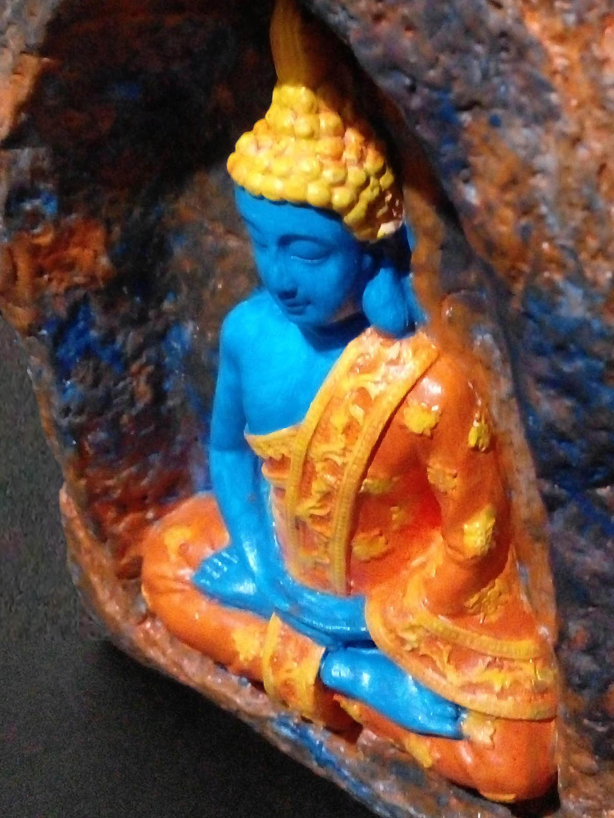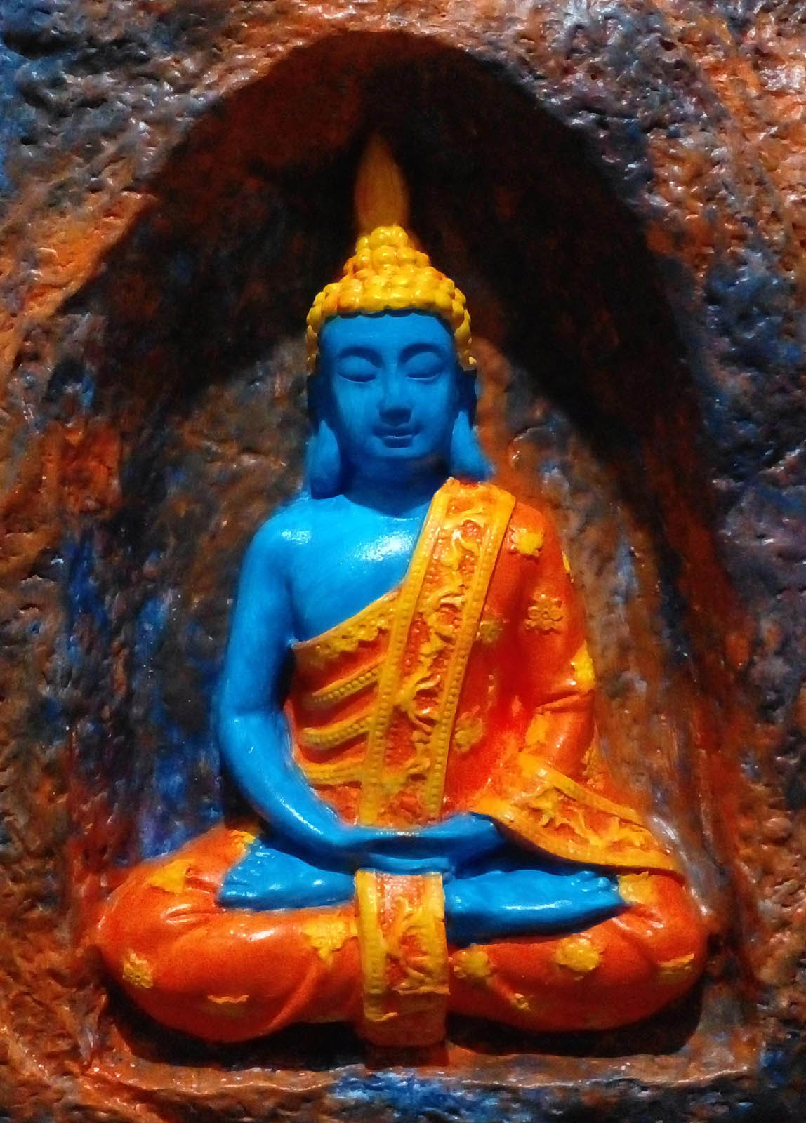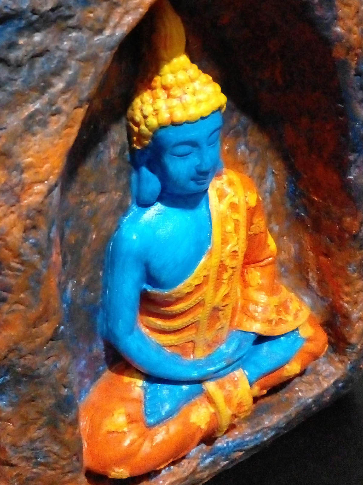 Detaylar: Buda mavi renkli. Elbise turuncu renkli. Elbise işlemeleri sarı renkli. Saçlar sarı renkli. Mağara turuncu , kahverengi ve mavi renkli.